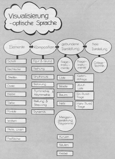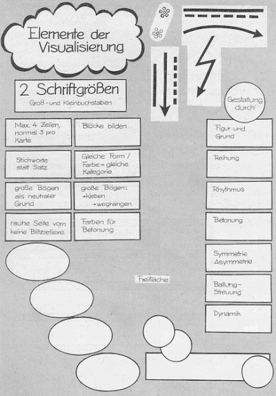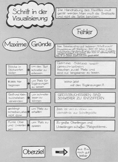 Damit alle Teilnehmer während der Sitzung und auf dem anschließenden Fotoprotokoll alles lesen können, ist das Einhalten einiger Schreibregeln empfehlenswert (s. Abb. 2.4.2). Auf dem Packpapier sind mit den verschiedenen Karten verschiedenste optische Darstellungsformen einsetzbar. Die Abbildungen 2.4.3 und 2.4.4 geben einen Überblick über gängige Visualisierungselemente. Grundsätzlich ist hier der Phantasie der Moderatoren und Teilnehmer nur die Grenze der Lesbarkeit gesetzt. Weitere Informationen hierzu finden sich bei Kleber et al. (1985, 119ff).