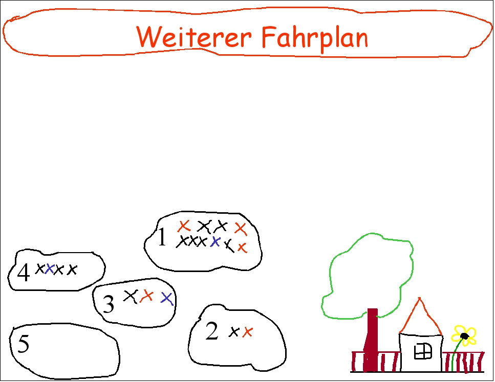 Dazu wurden offene Gesprächsrunden durchgeführt, bei denen zur Strukturierung des Ablaufs, zur Visualisierung der Inhalte und zur Einbeziehung derTeilnehmer in die Planungen Metaplan-Technik Verwendung fand. Hier soll es nicht um die Inhalte gehen; das Beispiel soll vielmehr die Spanne der Einsatz- und Gestaltungsmöglichkeiten der Metaplan-Technik vorführen.